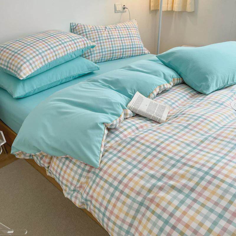 ins水洗棉四件套纯色格子床上被套磨毛床笠床品学生宿舍三件套