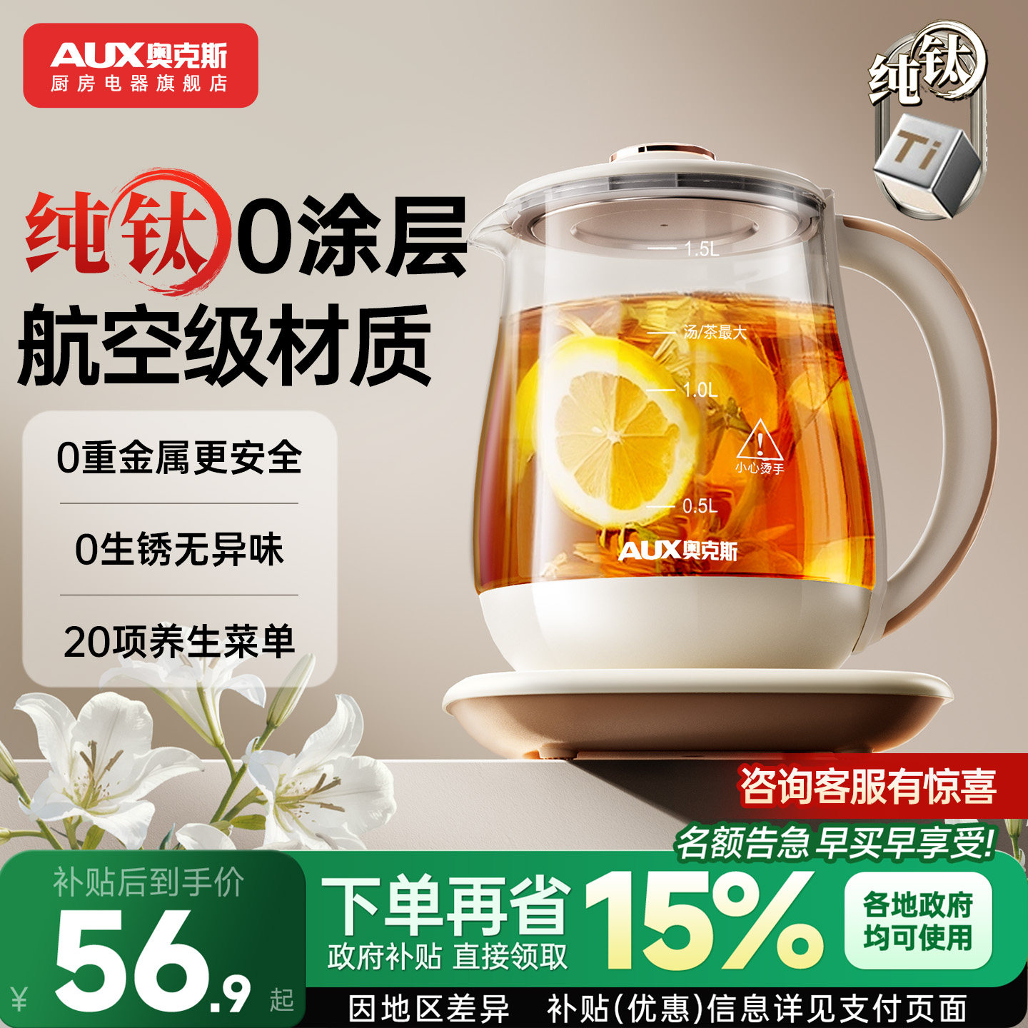 奥克斯纯钛养生壶炖煮一体2026新款烧水壶家用多功能煮茶壶办公室