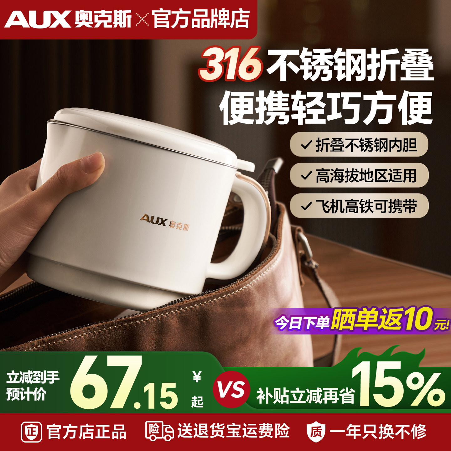 AUX奥克斯便携式烧水壶旅行可上飞机316不锈钢电热水杯热水壶