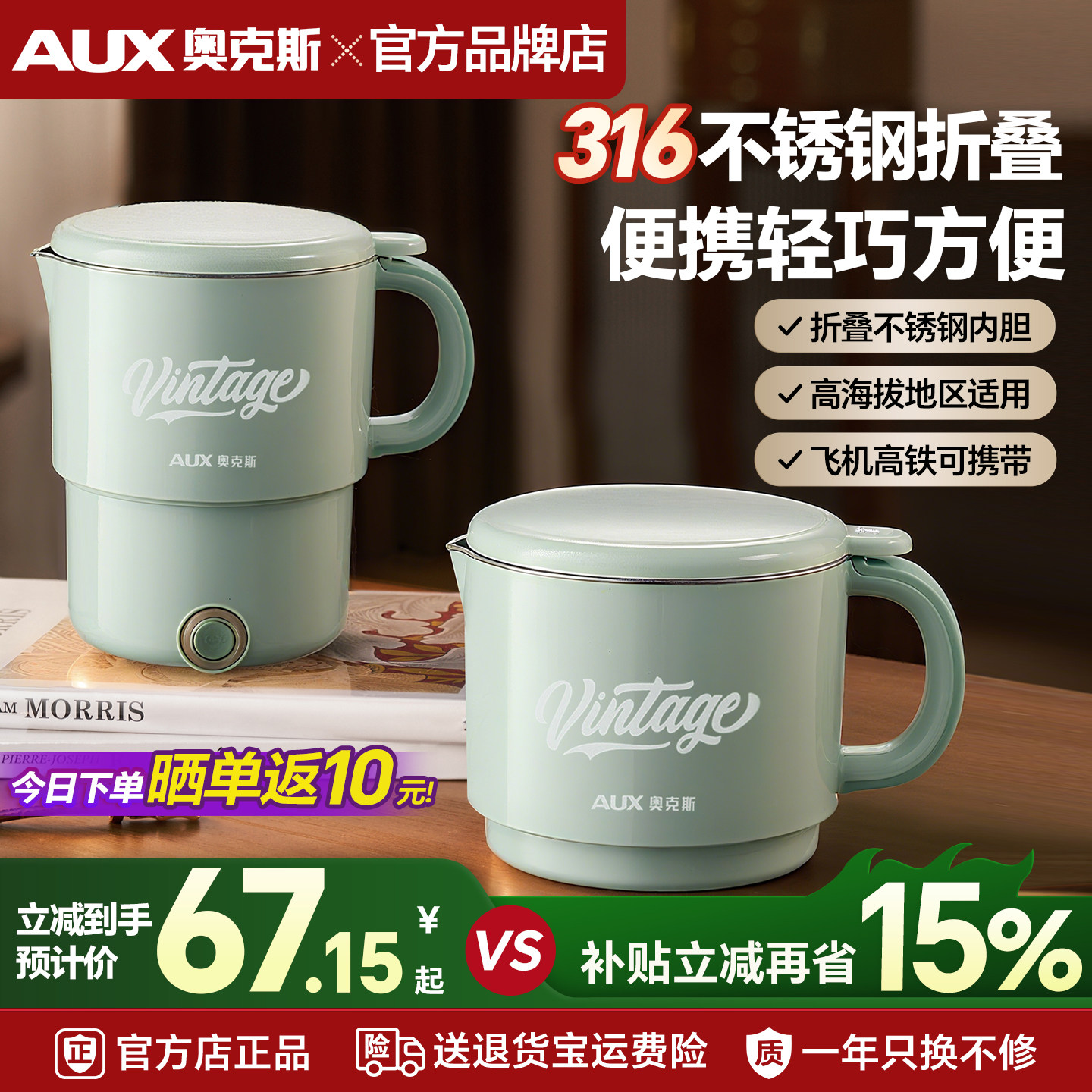 奥克斯316L不锈钢折叠水壶出差旅行便携式烧水壶保温一体家用小型