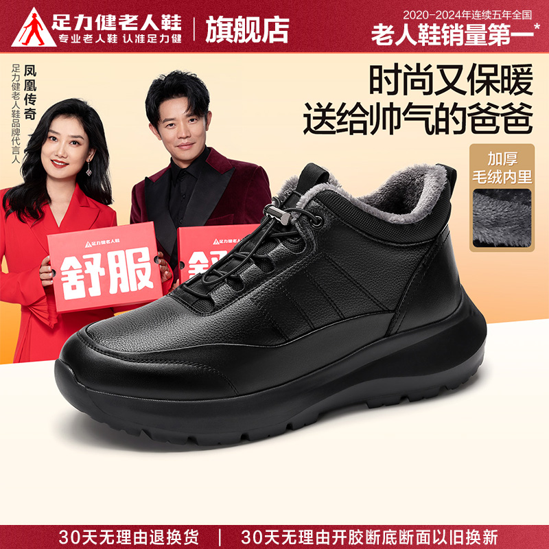 足力健老人官方旗舰店正品加绒爸爸鞋加厚耐磨保暖皮鞋老人休闲鞋