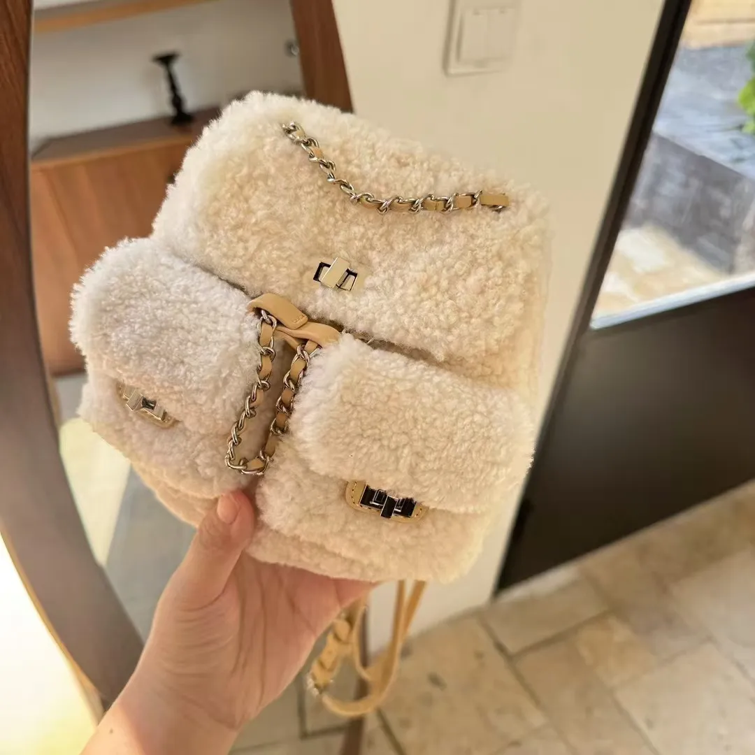 韩国小众新款小香风羊羔毛链条包双肩背包时尚百搭休闲真皮书包女