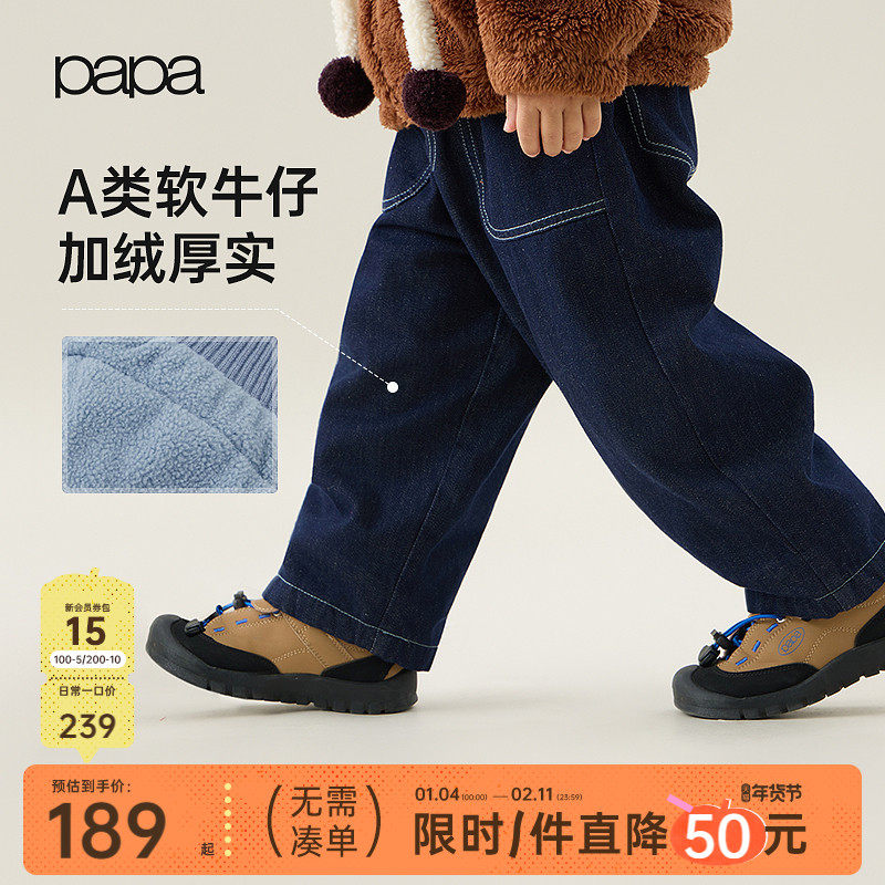 papa爬爬冬季儿童牛仔裤加绒加厚男女童假两件宽松经典百搭早春