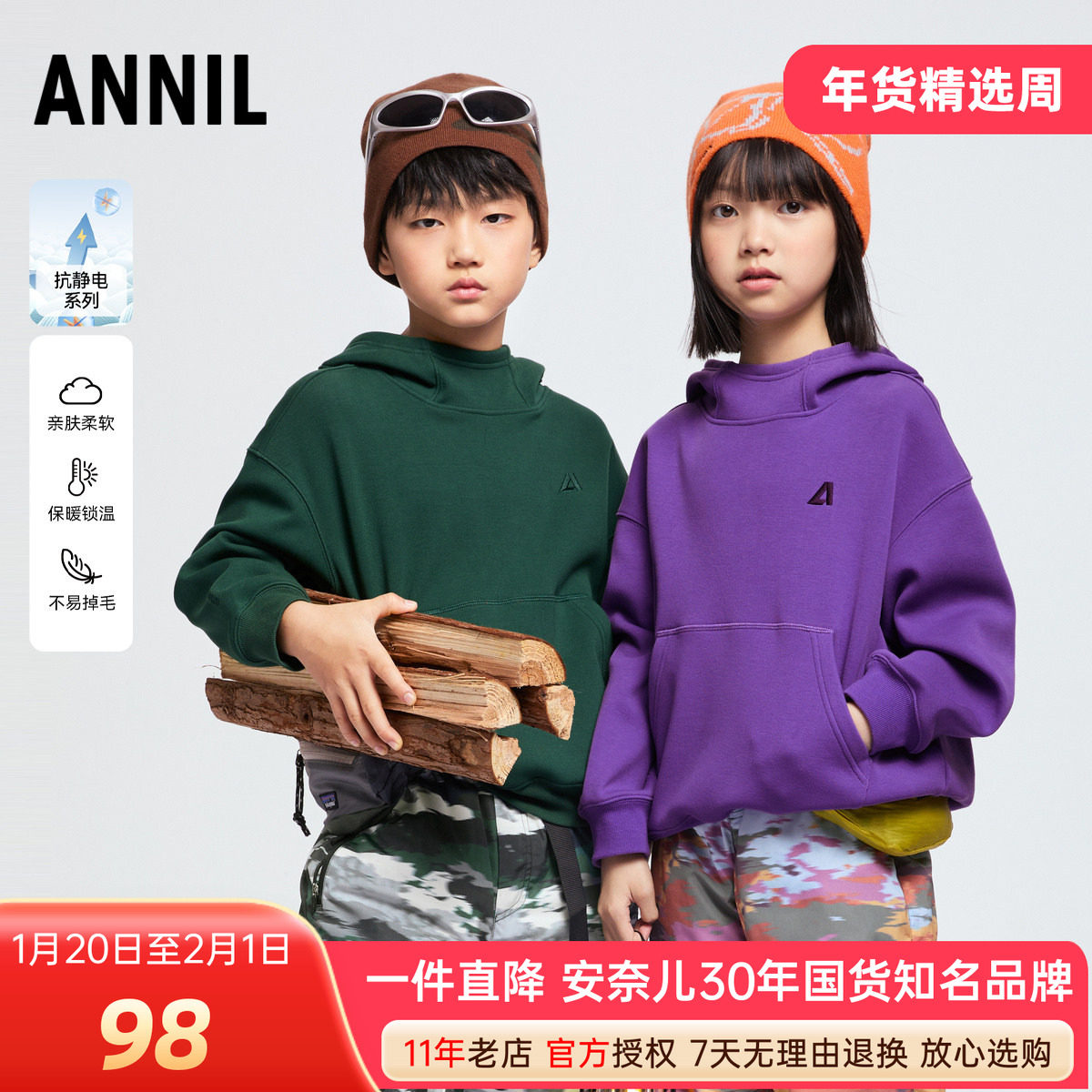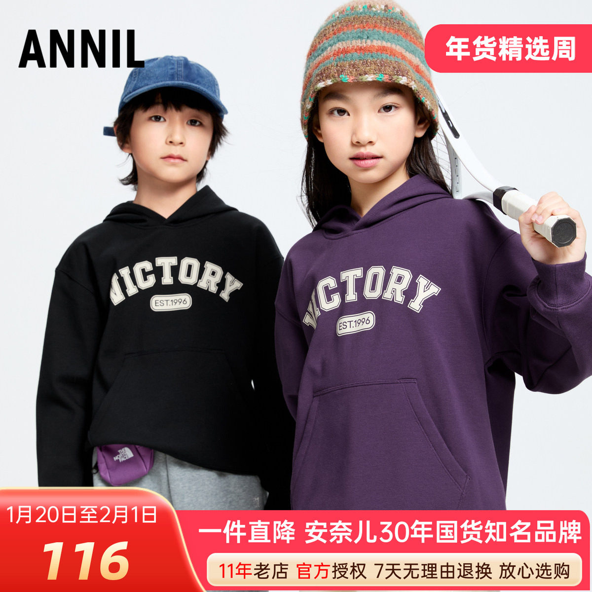 安奈儿男女童装加绒带帽卫衣2024冬新款加厚保暖长袖上衣潮酷百搭