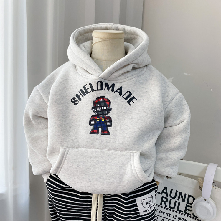 蔡爸爸童装时尚带帽卫衣冬装加绒加厚灰色套头男女卫衣A27+1321