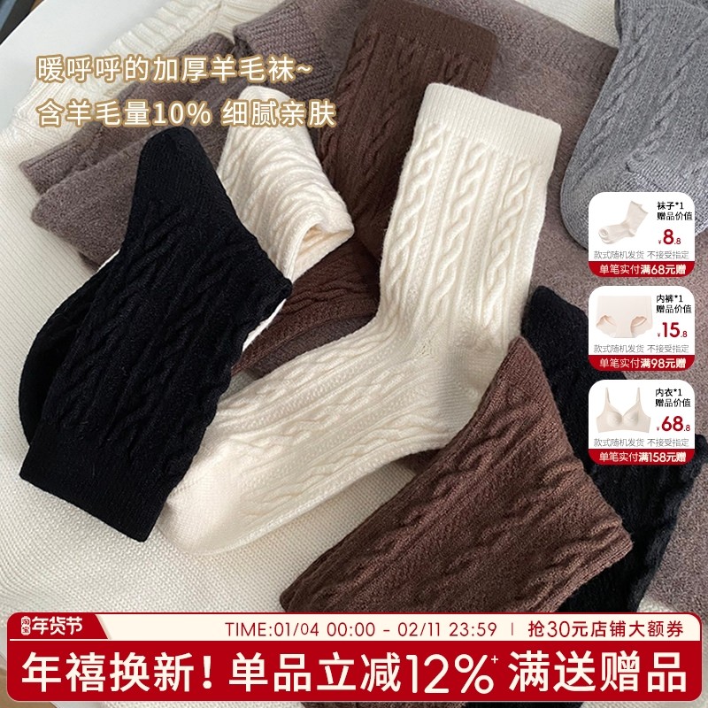 袜子女冬季加厚羊毛袜温暖扎实麻花纹中筒袜纯色百搭保暖黑白棉袜