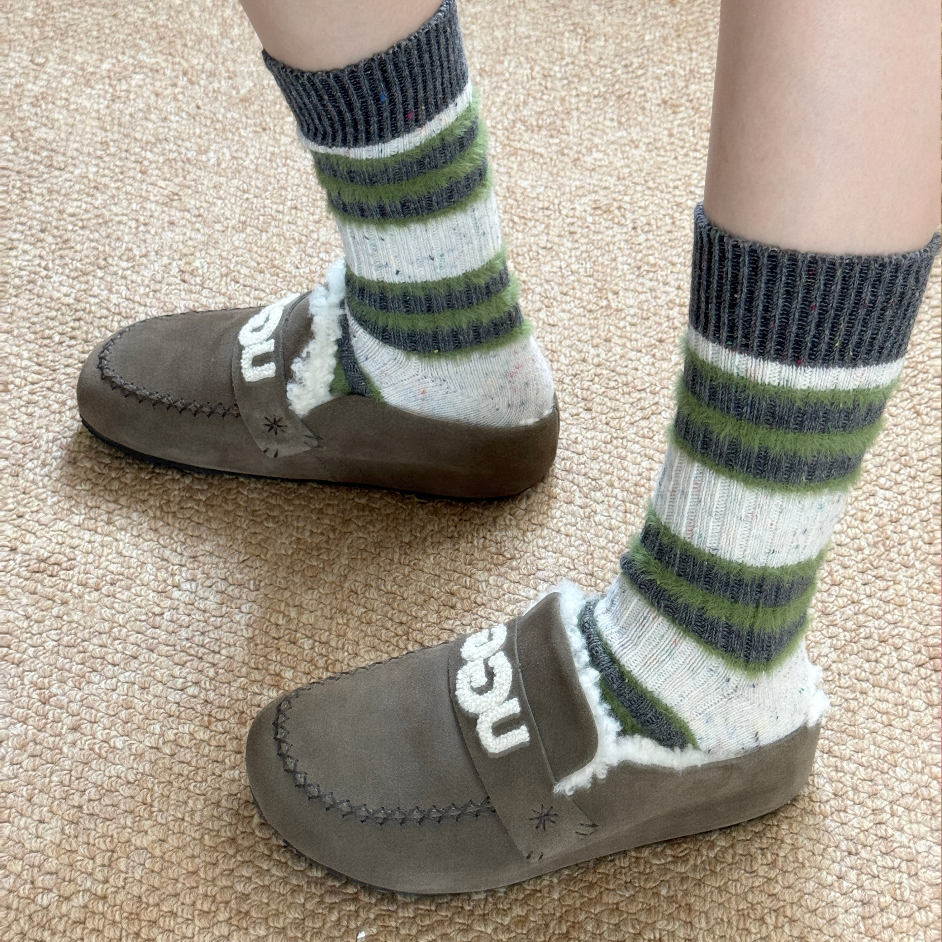文艺复兴25秋冬新款保暖加厚羊毛袜子女简约条纹粉红色中筒堆堆袜