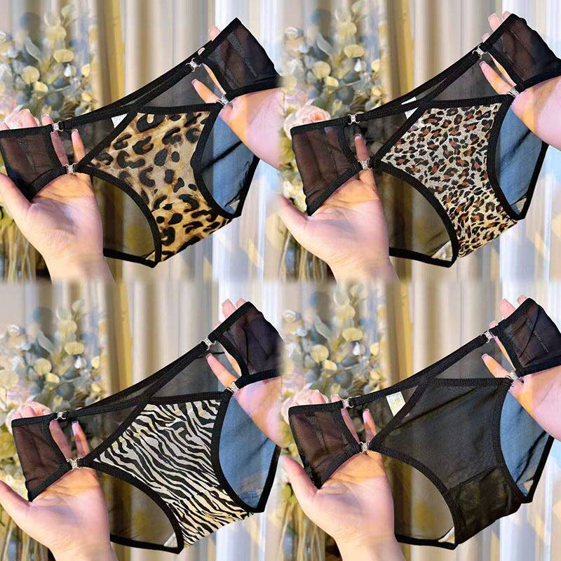 新品女士网纱透明性感内裤女纯欲火辣豹纹情侣诱惑镶钻镂空三角裤