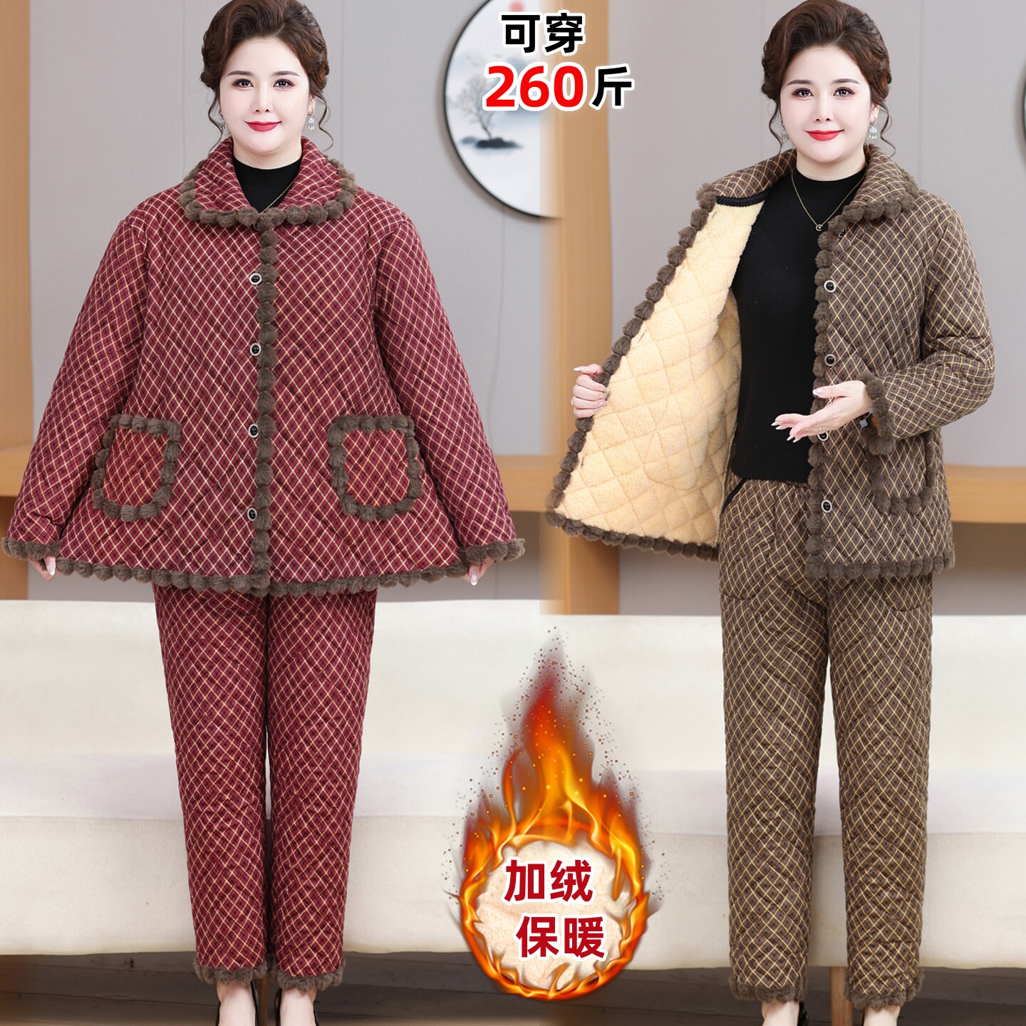 中老年女加肥加大码保暖加绒套装胖妈妈冬装棉服特体棉袄老人棉衣