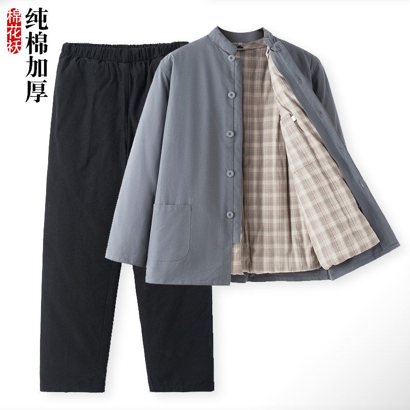 中老年棉服男老式手工纯棉花棉袄棉裤套装加厚可拆卸冬装老人棉衣
