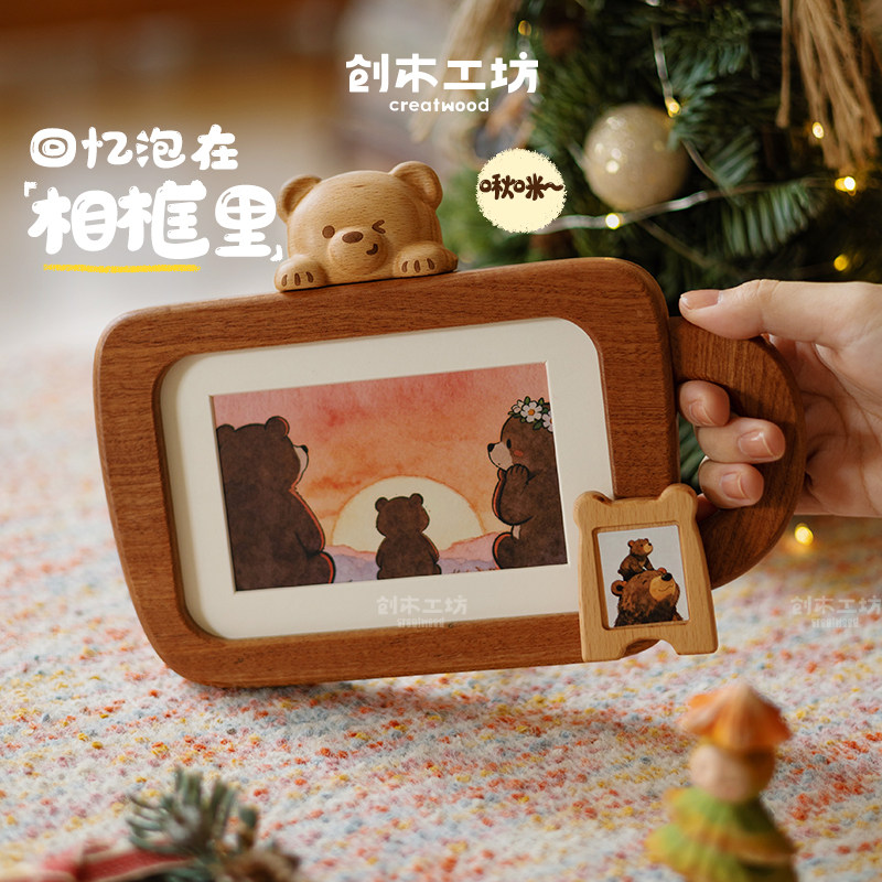 小熊咖啡杯相框/创木工坊实木6寸相框可爱风卡通造型可爱摆台摆件