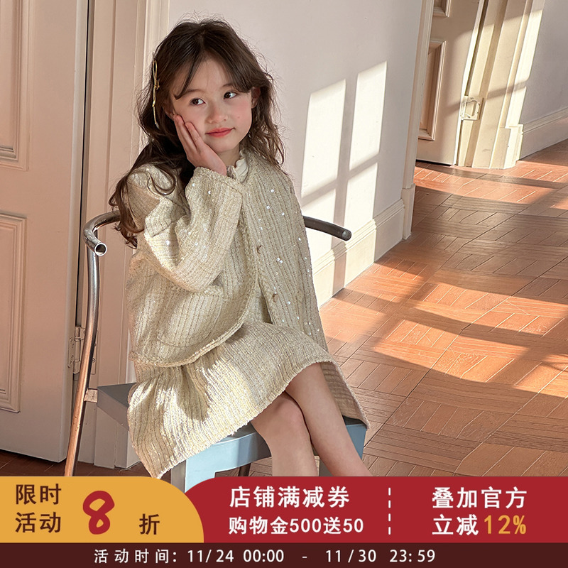 中大童春季韩版套装 女童洋气小香风亮片背心裙+儿童外套时髦上衣