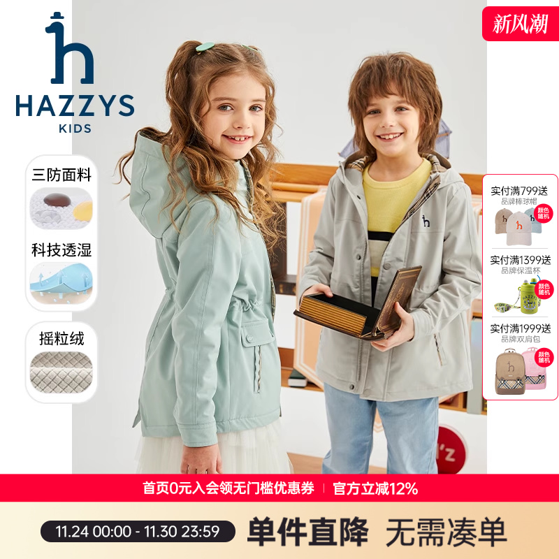hazzys哈吉斯童装男女童风衣春季新品防护三防加绒连帽厚外套