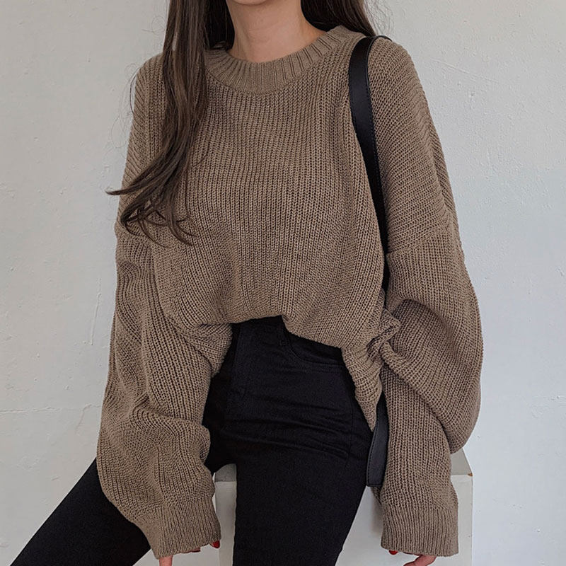韩国chic秋季慵懒风简约圆领套头宽松休闲纯色长袖针织衫毛衣女