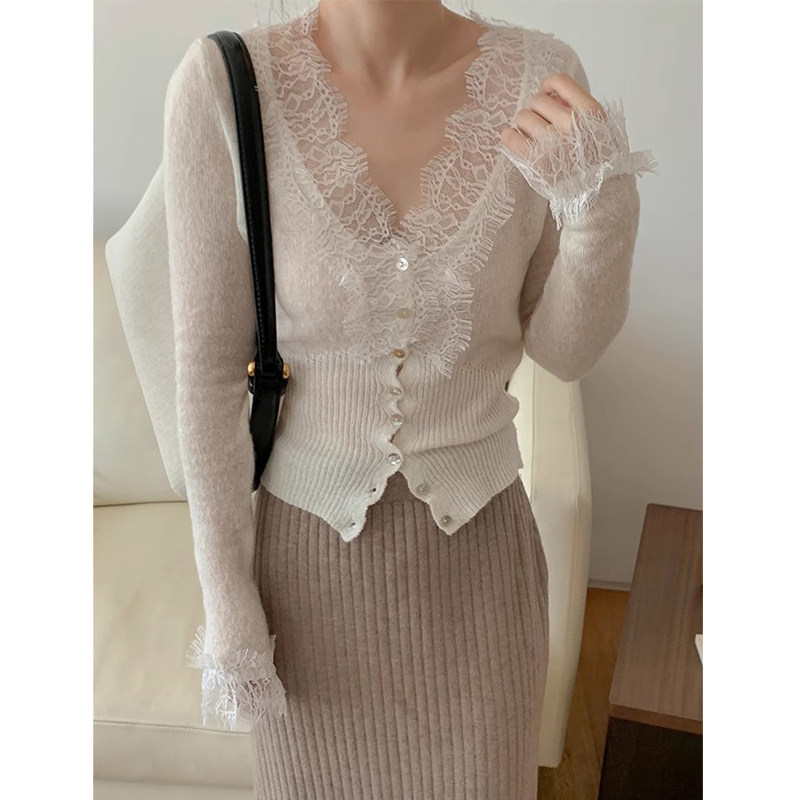 韩国chic秋季法式温柔风V领镂空蕾丝钩花设计百搭长袖针织开衫女