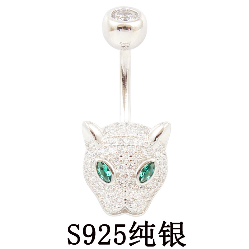 肚脐钉通体纯银925性感欧美S925防过敏粗针豹子头满锆石S925脐环