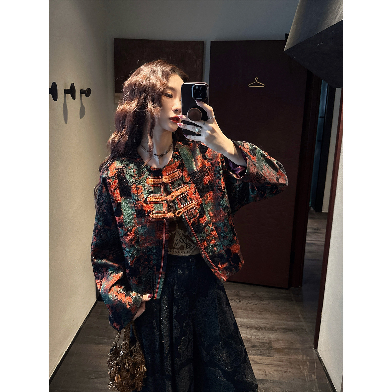 GESGOO气质优雅单排扣秋季外套女2024新款新中式印花真丝上衣长袖