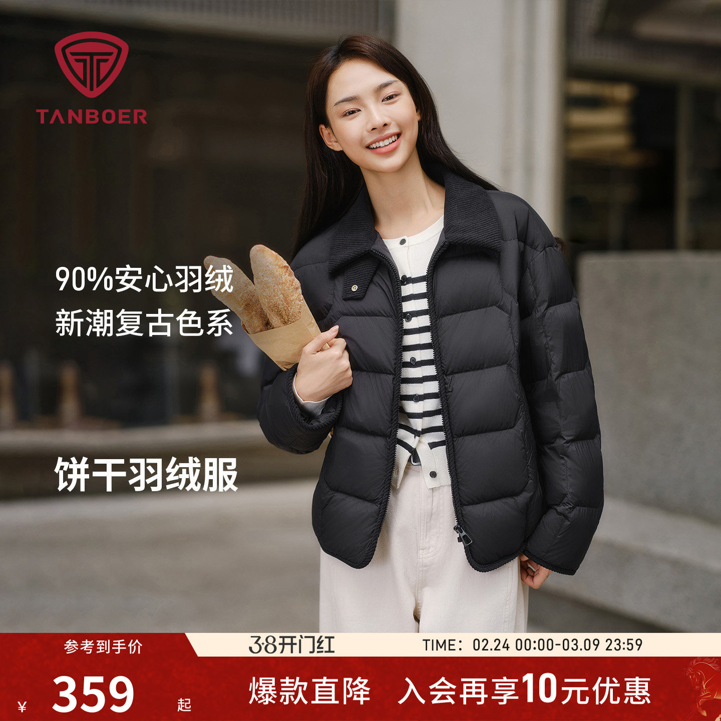 坦博尔2025秋季新款衬衫领巴恩风羽绒服女款拼接轻薄短款百搭外套