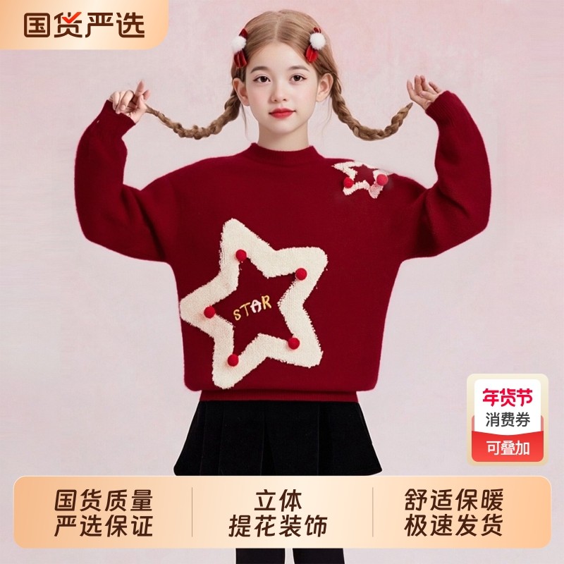 女童红色毛衣加绒秋冬款2025新款中大童宽松加厚针织衫圣诞上衣潮