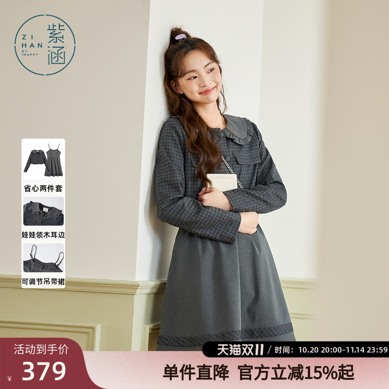 紫涵灰色格纹外套木耳边娃娃领连衣裙短裙子两件套装女春秋季新款