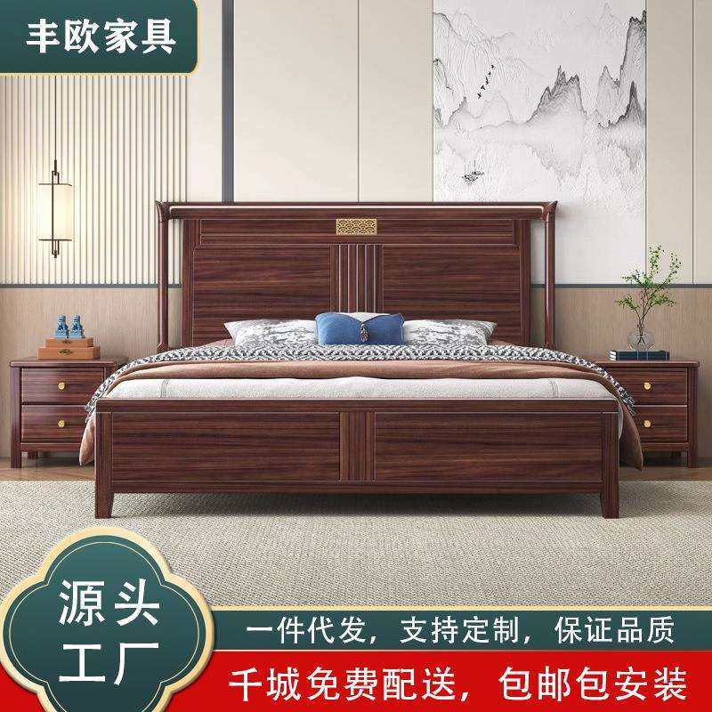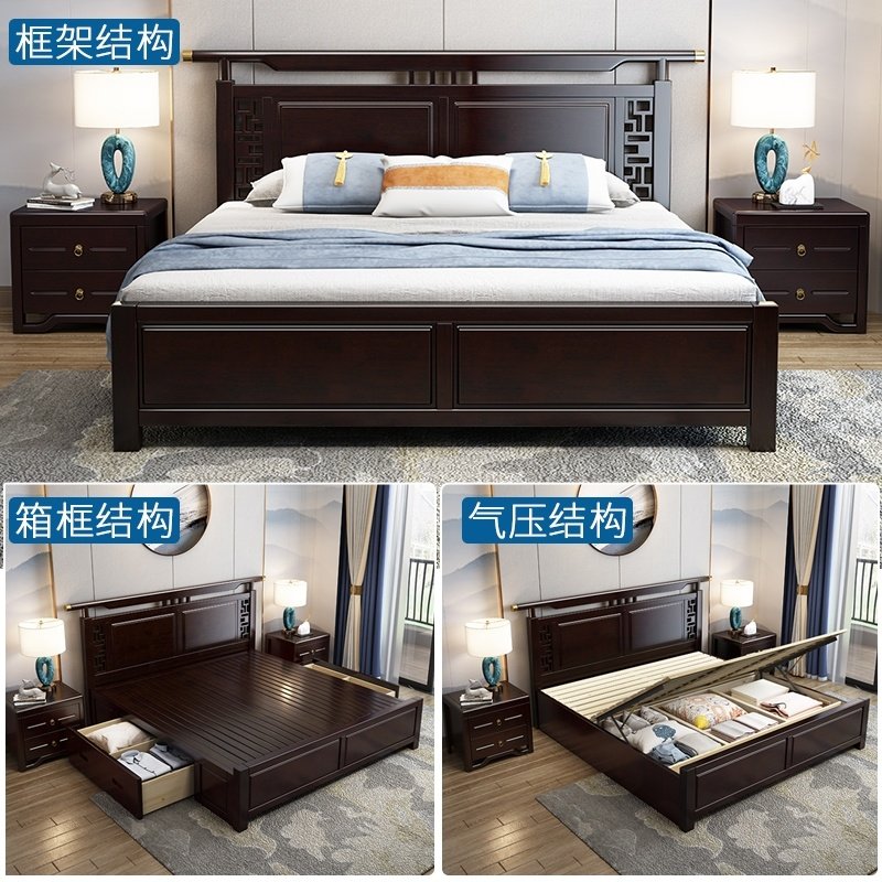 新中式乌金木实木床1.8米双人卧室高箱储物中国风2*2.2米别墅大床