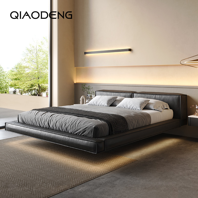 乔登/意式极简主卧大床2*2.2米双人现代高端轻奢真皮悬浮床豆腐块