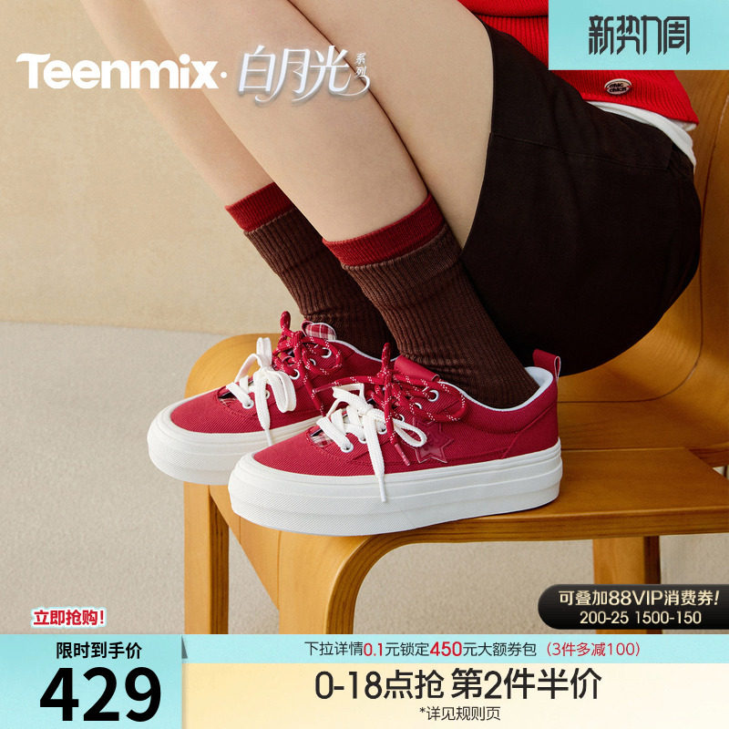 天美意双鞋带厚底小白鞋帆布鞋女红色运动板鞋2026夏新款BN141BM6
