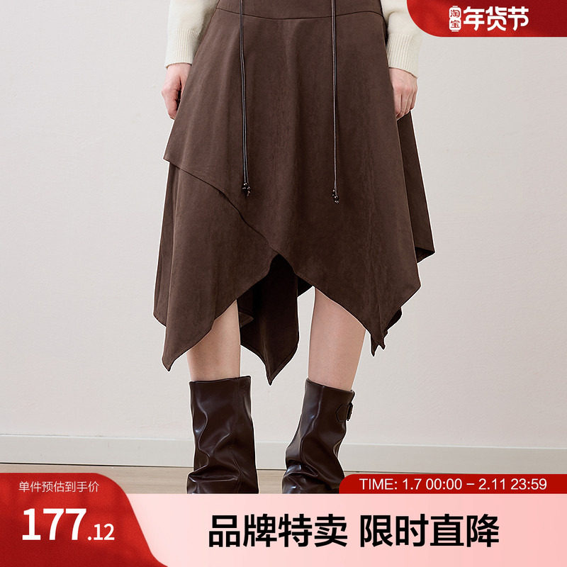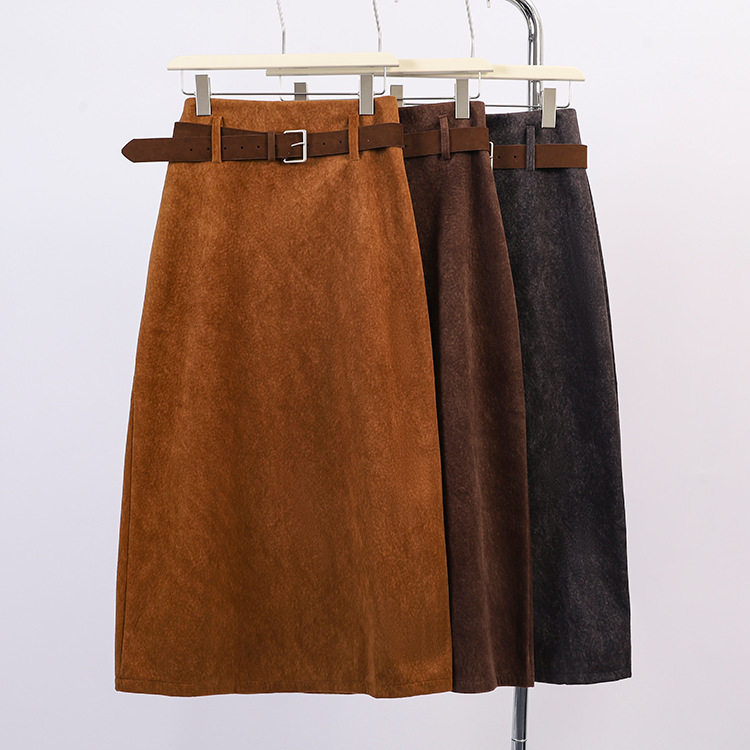 辰米范 摩登都市 咖色麂皮半身裙女可拆腰带复古气质直筒中长裙