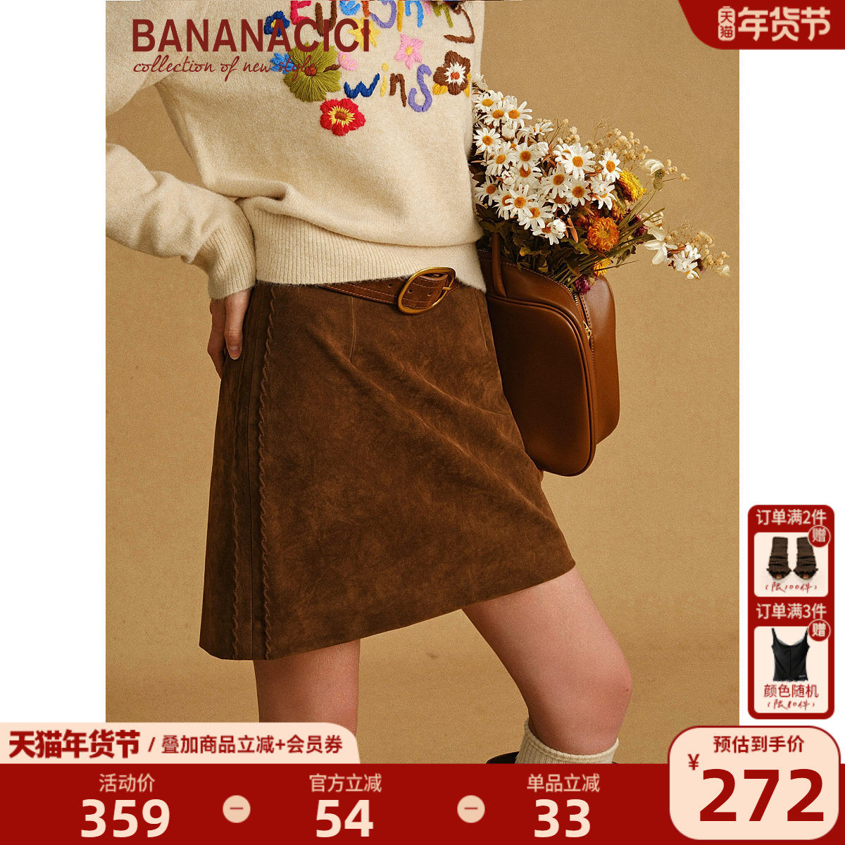 BANANA CICI2025年冬季新款百搭休闲立体浮雕绣花麂皮A字短半裙