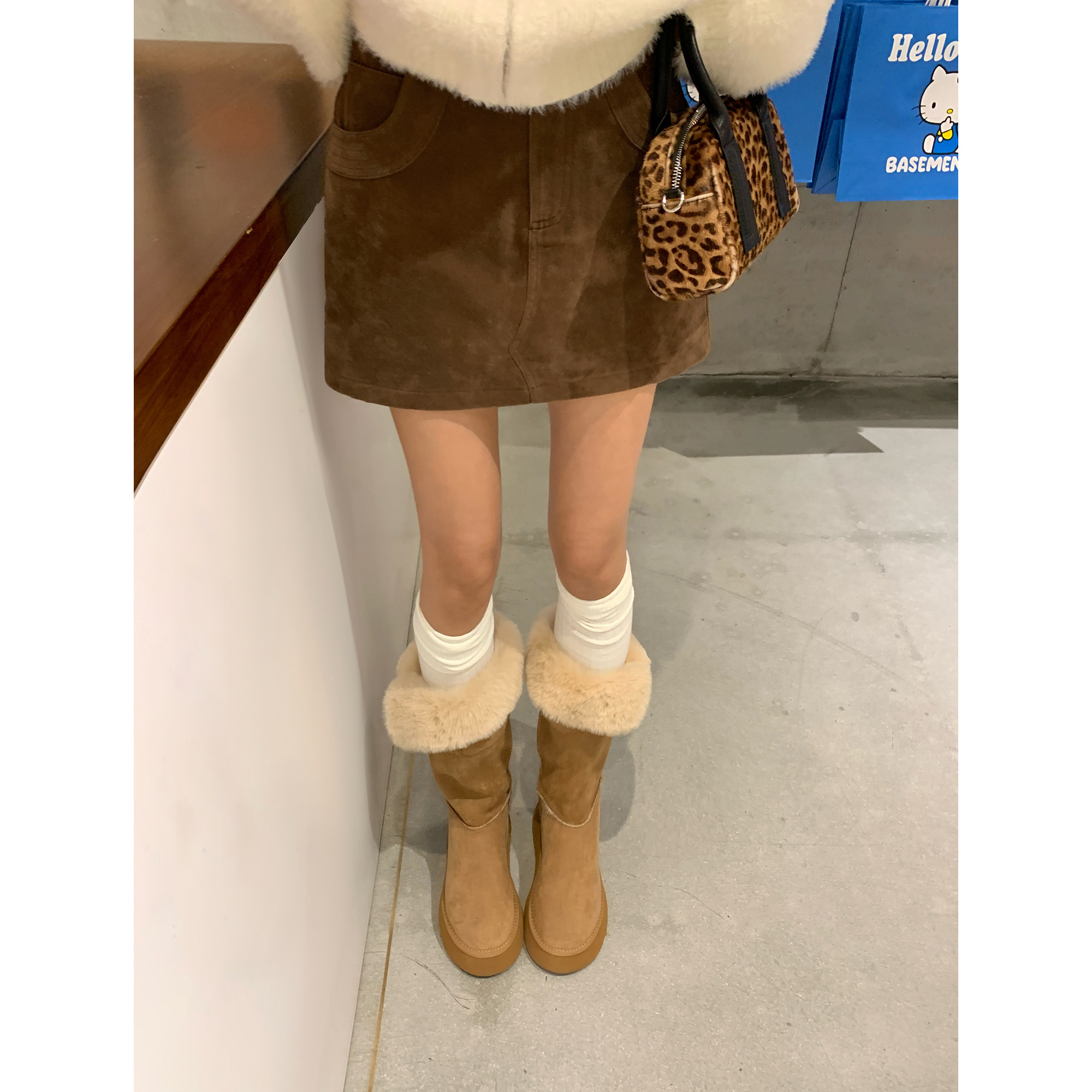 pusumede低调吸睛 咖色复古麂皮半身裙女秋冬可拆腰带百搭a字短裙