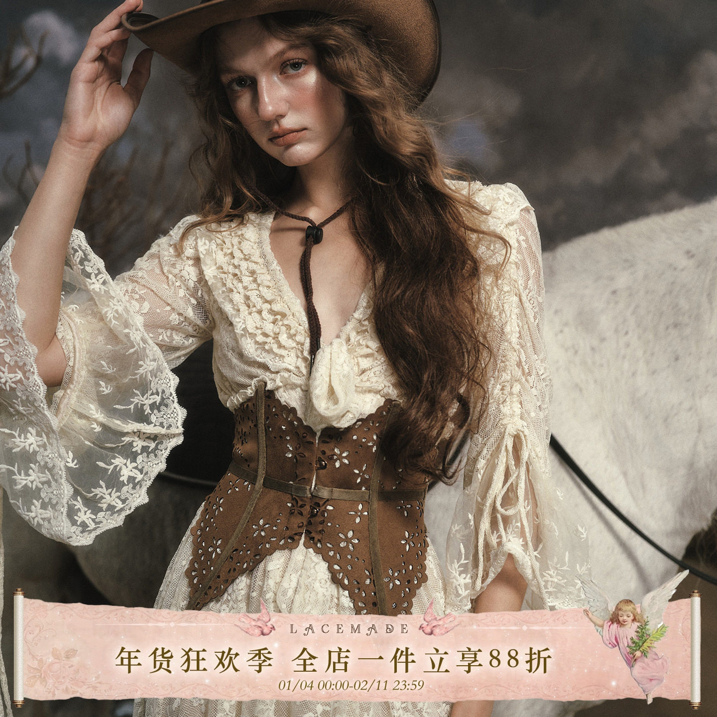 LaceMade 白马公主 法式复古重工蕾丝v领连衣裙麂皮鱼骨腰封套装