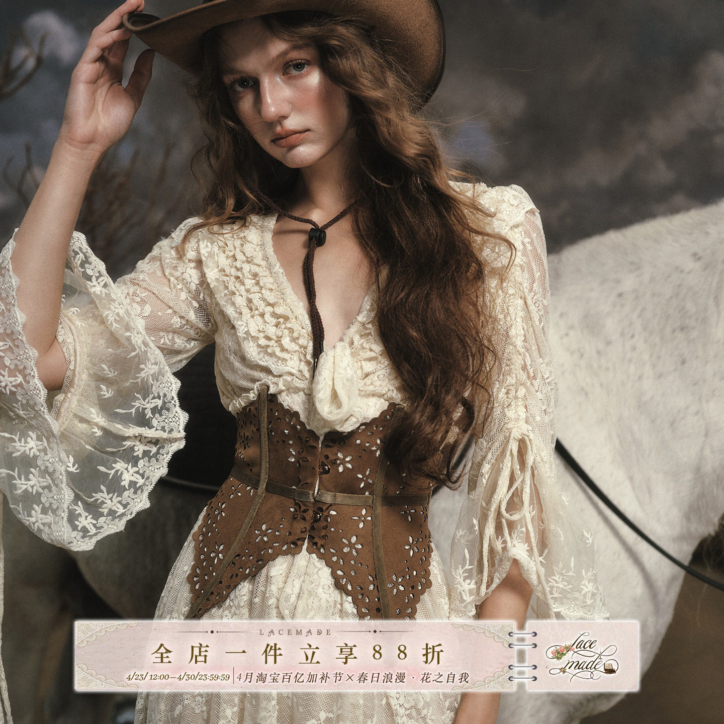 LaceMade 白马公主 法式复古重工蕾丝v领连衣裙麂皮鱼骨腰封套装