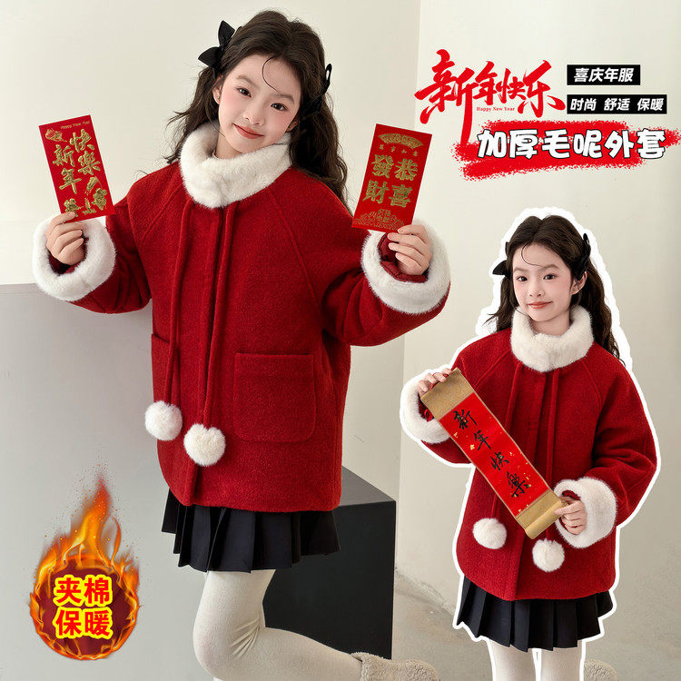女童秋冬装红色呢子大衣2025新款韩版中长款加绒加厚大毛领拜年服