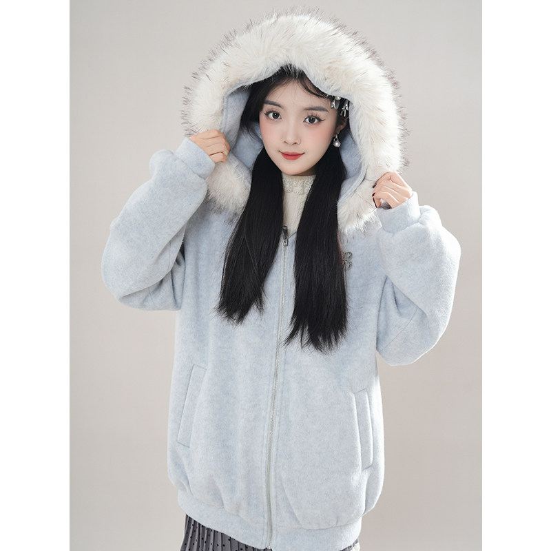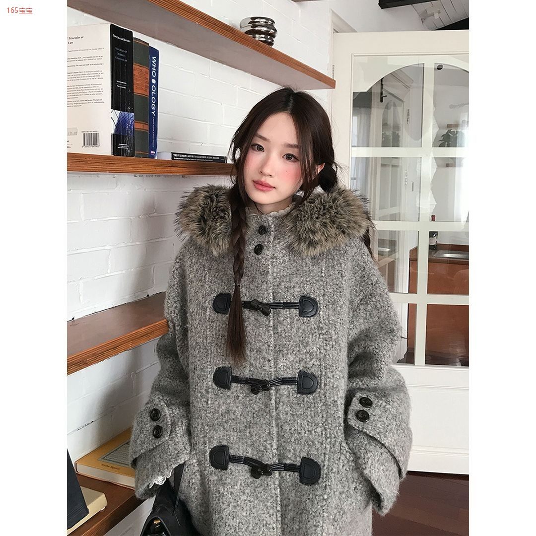 奶呼呼大毛领毛呢拉链连帽外套2024秋冬新款甜美加厚保暖呢子大衣