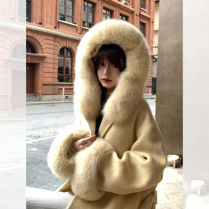 狐狸毛大毛领双面羊毛呢子大衣2025秋冬小个子保暖连帽毛呢外套女