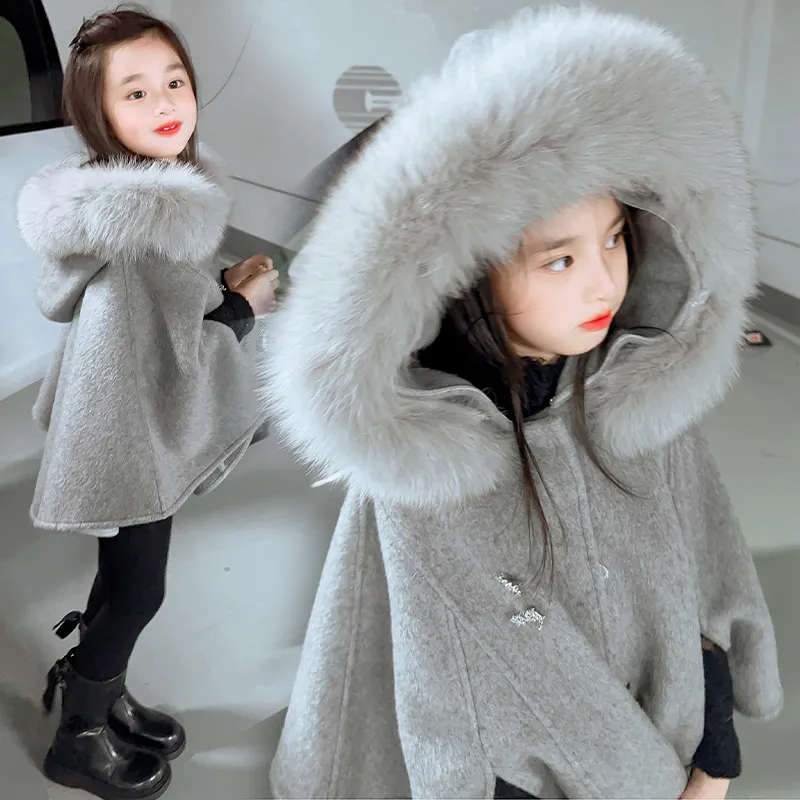 女童高级感呢子斗篷大衣2025秋冬款宝宝洋气大毛领连帽毛呢外套