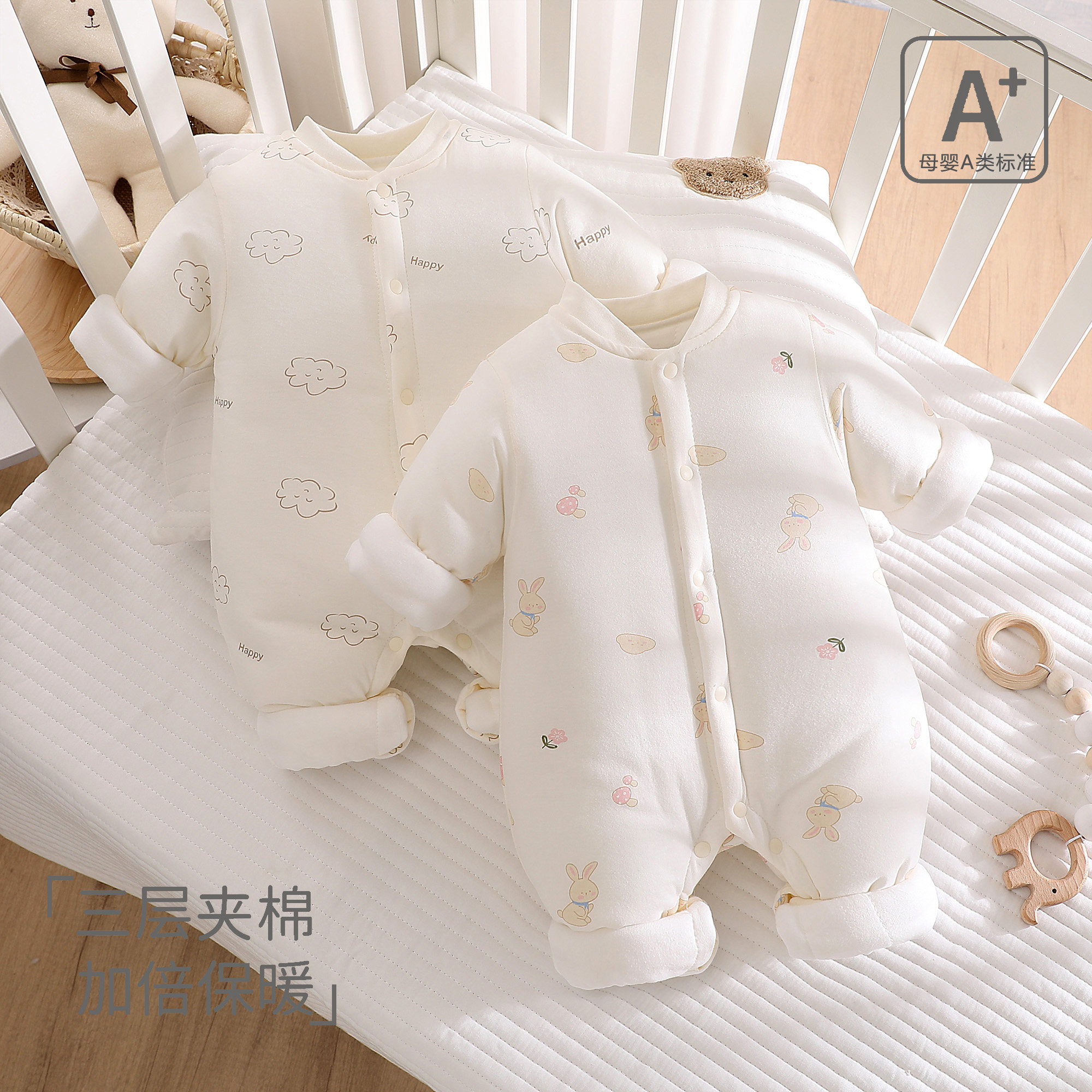 婴儿衣服新生儿秋冬夹丝保暖加厚哈衣初生儿春秋ins风宝宝连体衣