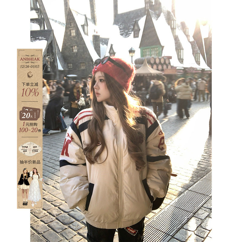 安妮不火 复古徽章撞色条纹立领夹克棉服女微胖大码美式街风棉衣