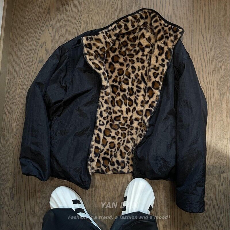豹纹仿貂绒情侣外套秋冬新款男生立领棉衣潮牌宽松夹克女棉服加厚