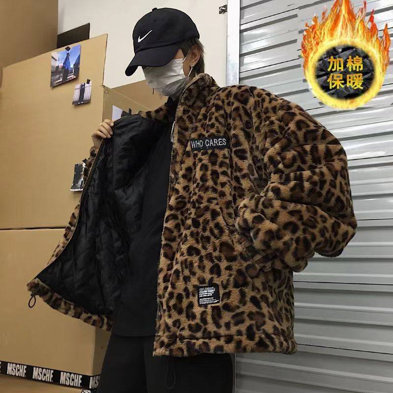 豹纹仿貂绒情侣外套冬季新款男生立领棉衣潮牌宽松夹克女棉服加厚