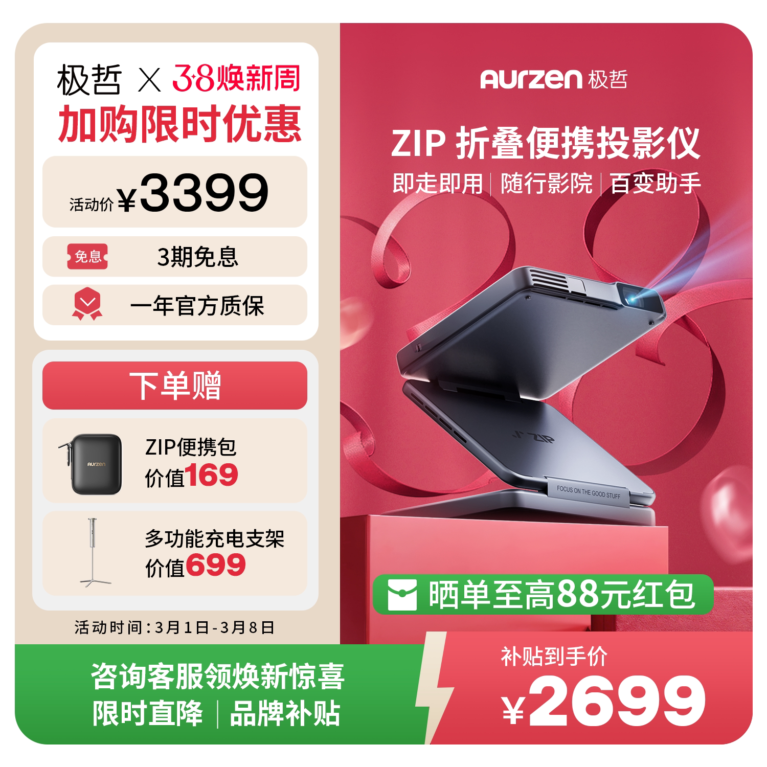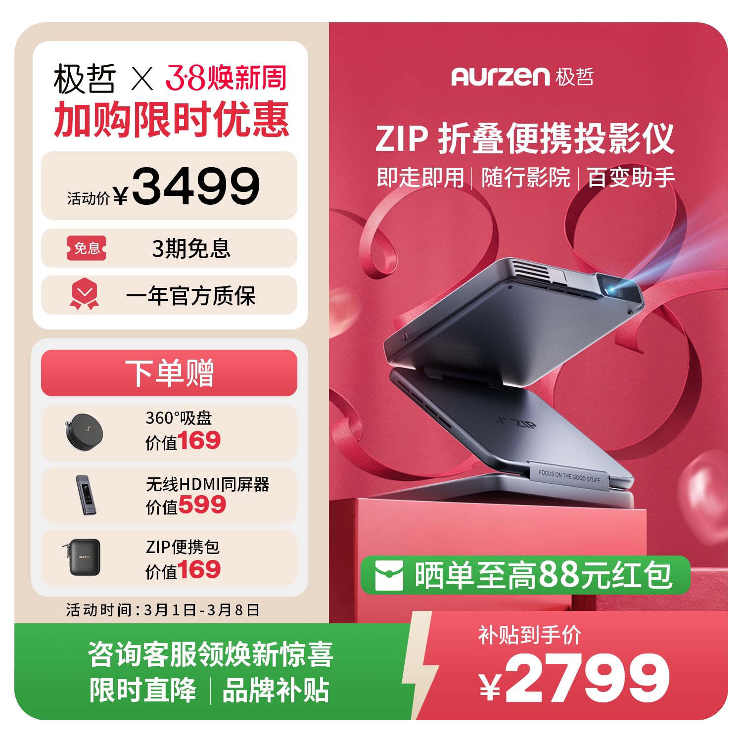 极哲ZIP Aurzen真便携三折叠投影卧室办公移动投影机内置电池户外露营节日送礼【多功能套装版】