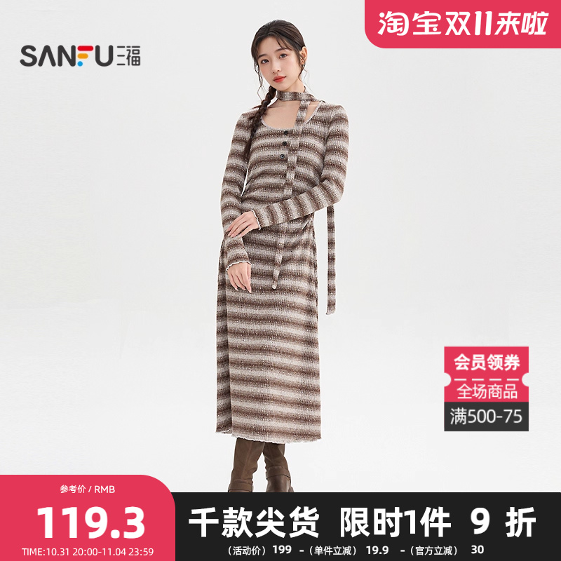 三福连衣裙2025新款冬季飘带围脖收腰气质内搭条纹长裙女装511591