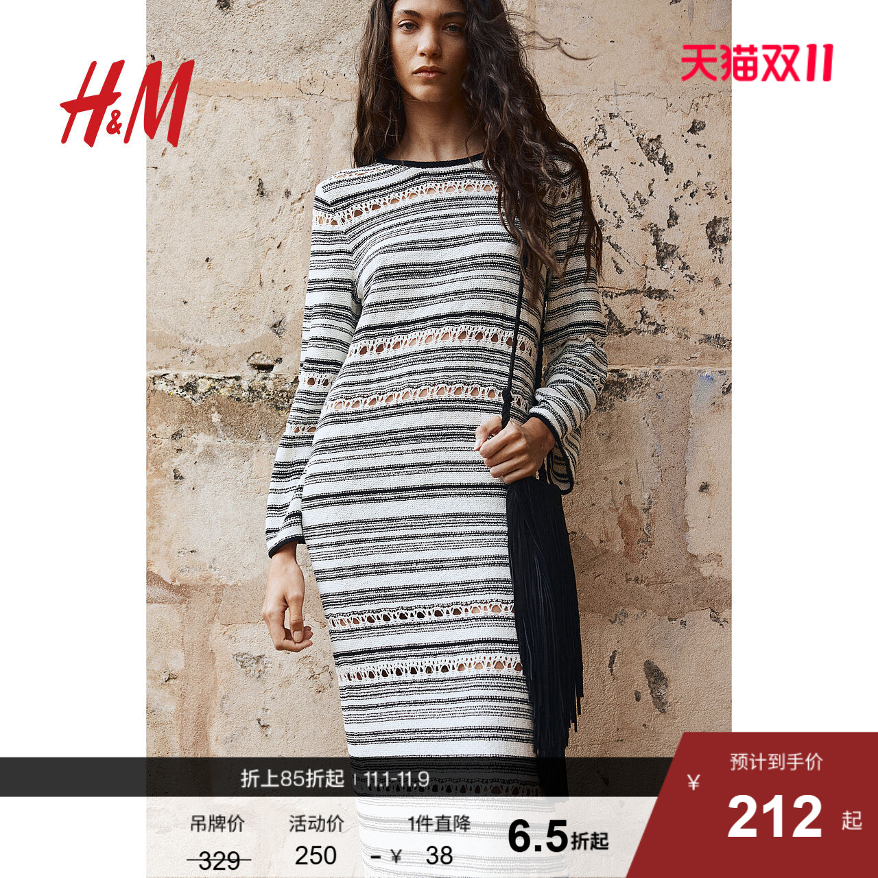 HM女装连衣裙25秋季新款黑白穿搭双反面圈绒针织条纹长裙1269546
