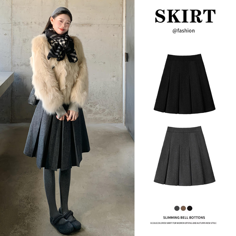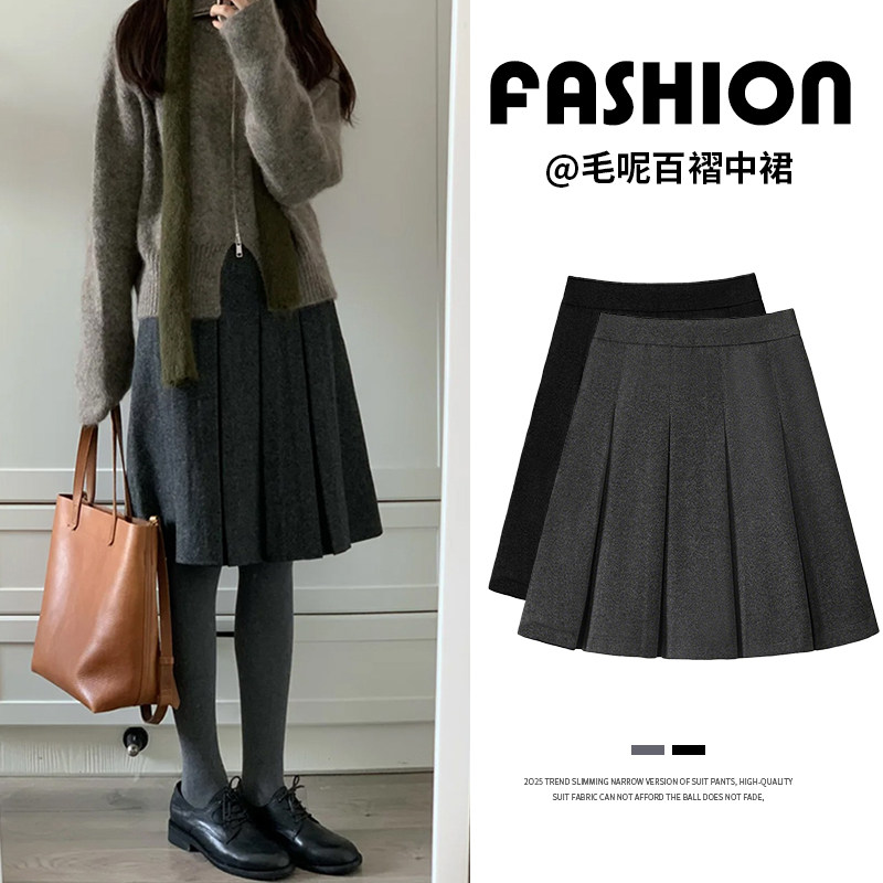 复古百搭高腰羊毛呢百褶裙女秋冬新款高智感知识风a字半身裙中裙