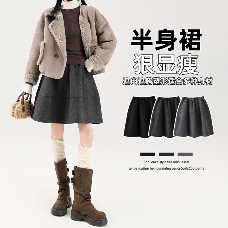 简约风毛呢A字半身裙高腰显瘦遮跨中裙miu系灰色中长款秋冬高级感