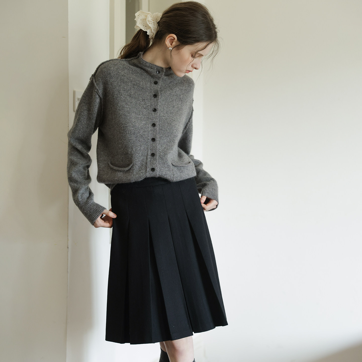 烟灰色高腰学院风百褶裙女秋冬高级毛呢半身裙小个子A字压褶中裙