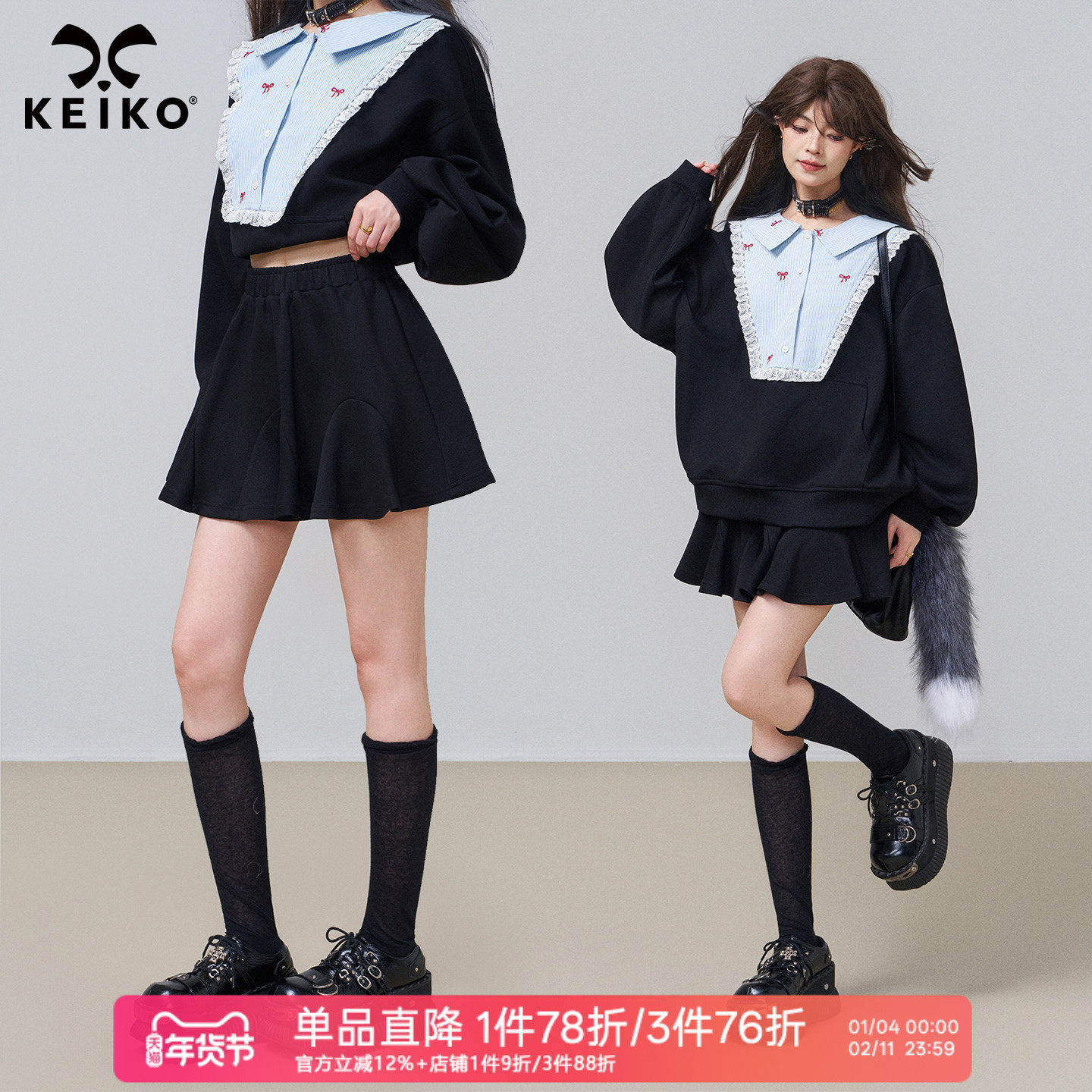 KEIKO立体剪裁不规则荷叶边半身裙秋季学院风黑色显瘦A字短裙伞裙