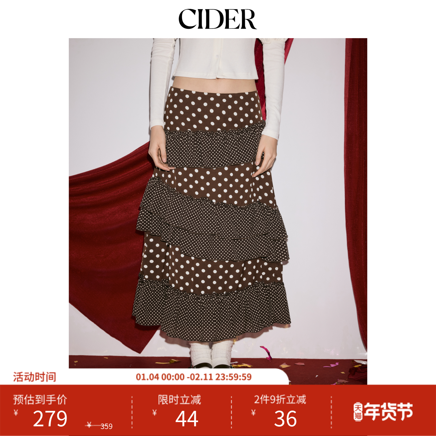 CIDER波点拼接荷叶边压褶中长裙多层褶边蛋糕裙半身裙114750476