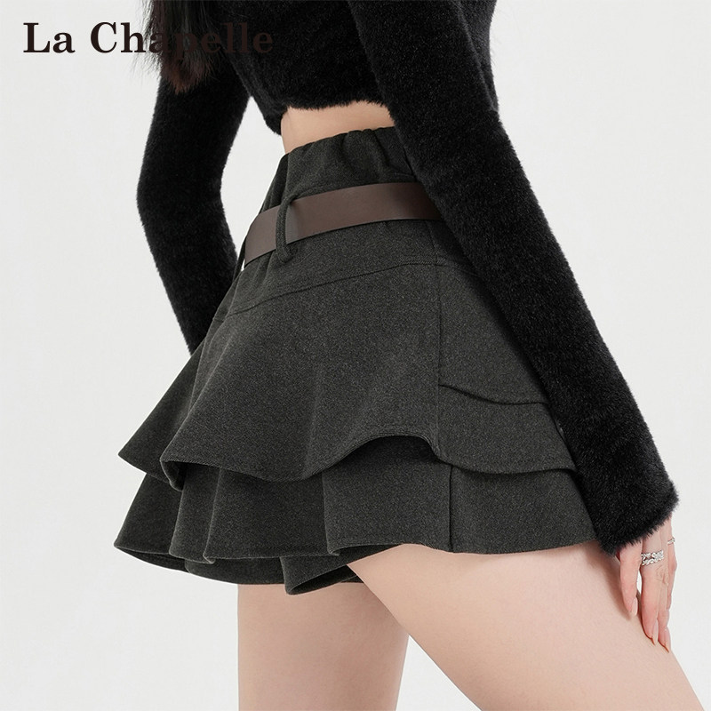 拉夏贝尔灰色毛呢荷叶边半身裙女秋冬新款高腰a字设计感蛋糕短裙