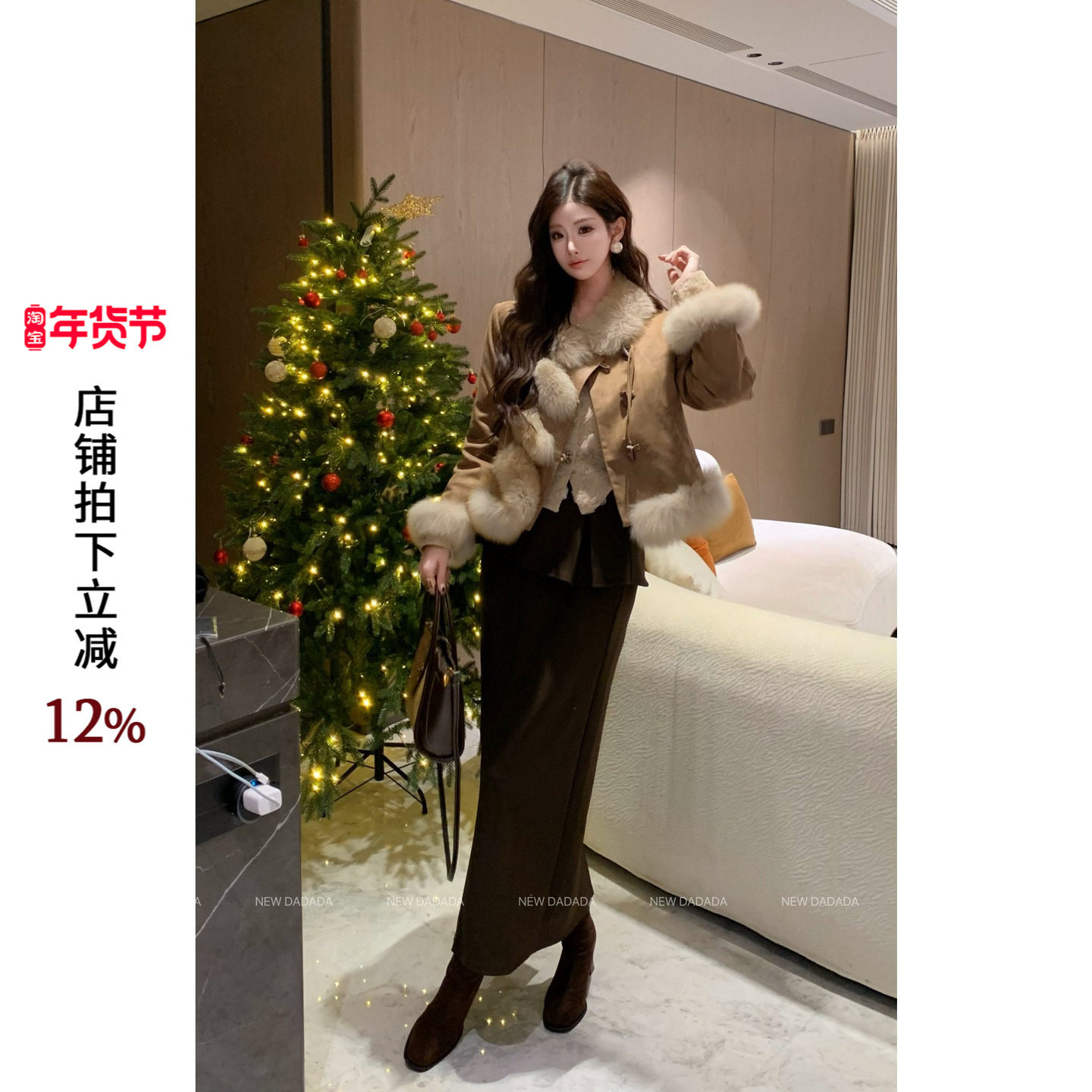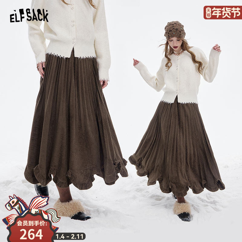妖精的口袋压褶绒感荷叶边半身裙女2025年冬季甜美显瘦咖色长裙子